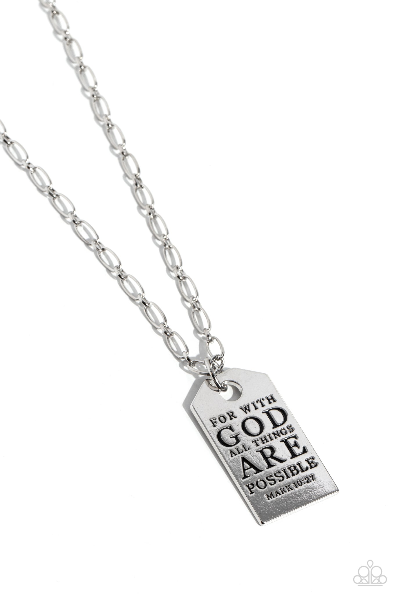 Dangling from simple silver links, a sleek silver hoop boosts a rounded rectangular plate. Stamped on the high-sheen silver pendant, the inspiring phrase "For with GOD all things ARE possible" is listed with the scripture reference "Mark 10:27" just below it in a more dainty font for a hopeful finish. Features an adjustable clasp closure.