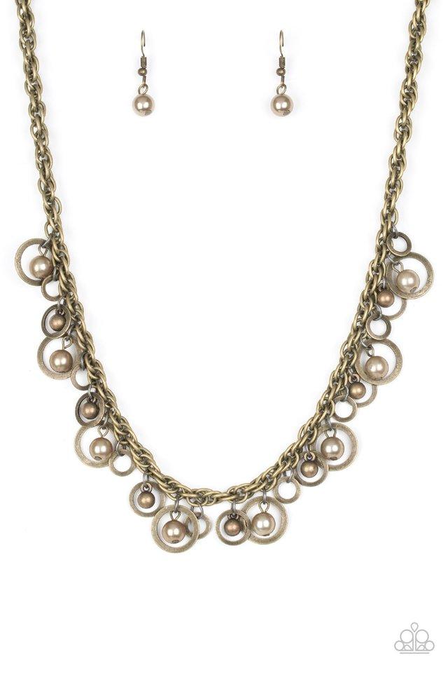 rushed in an antiqued shimmer, mismatched brass hoops, brass pearls, and dainty brass beads swing from the bottom of a bold brass chain below the collar for a refined look. Features an adjustable clasp closure.