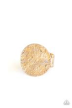 An oversized gold disc is etched in crisscrossing textures and hammered into light-catching ripples as it sits atop the finger unapologetically. Features a stretchy band for a flexible fit. Sold as one individual ring.