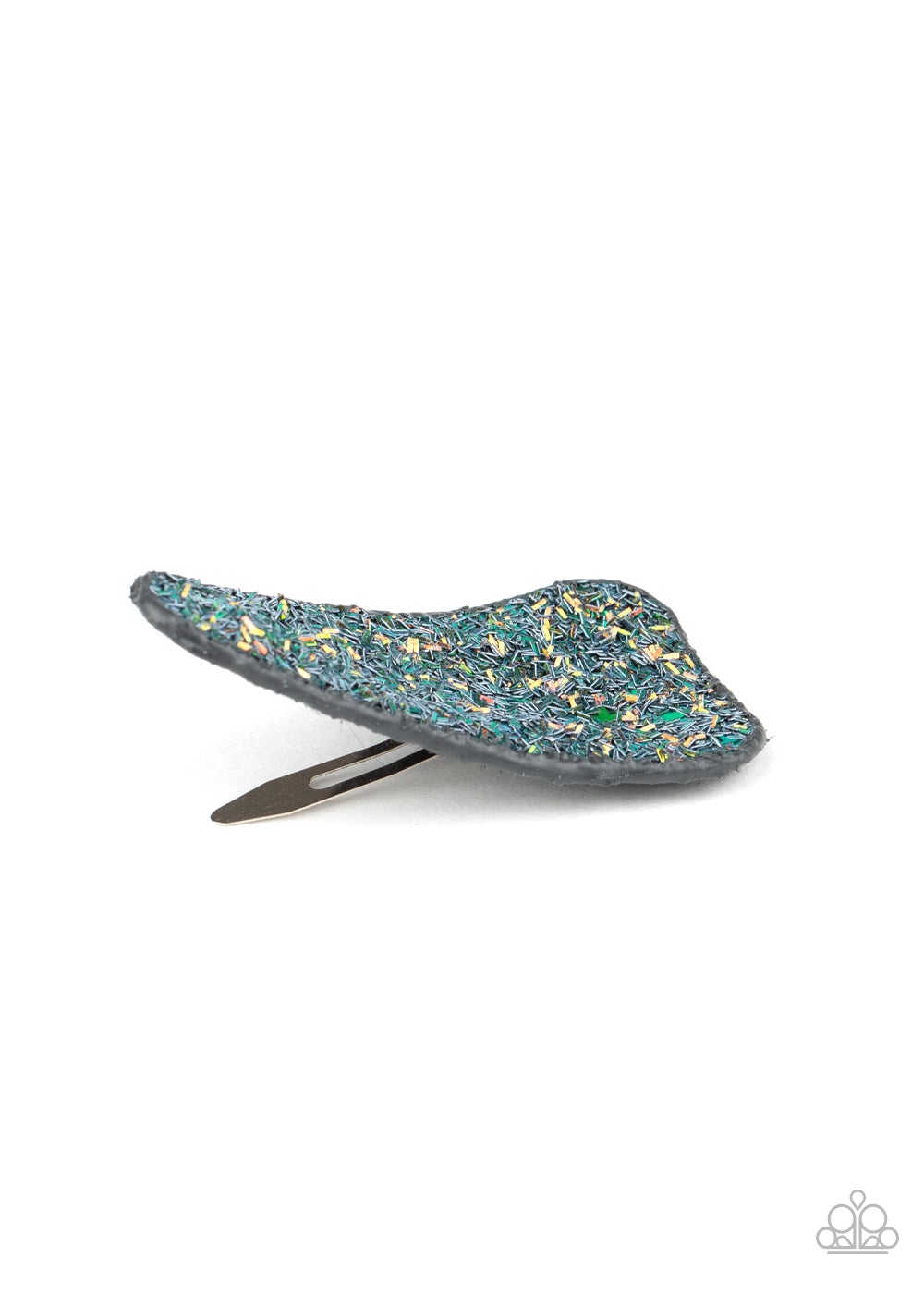 A collision of purple and iridescent sequins scatter across the front of a leather triangular frame, creating a glittery display. Features a standard snap clip on the back.